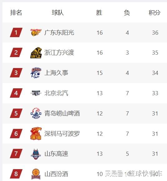 卫冕冠军广厦队,他们目前的战绩为16胜3负,排在积分榜第2名,而上海队则排在第三名,他们的战绩为15胜4负。目前,积分榜前三名的球队,已经与身后的球队逐渐拉开差距了。广东队和广厦队,他们已经领先北京队3个胜负场,而上海队也手握两个胜负场差距。尽管常规赛还剩下一大半赛程,不过,对于积分榜前四名的球队而言,任何一场胜利都是极为宝贵的。后面球队想要追上他们,恐怕也没有那么容易。